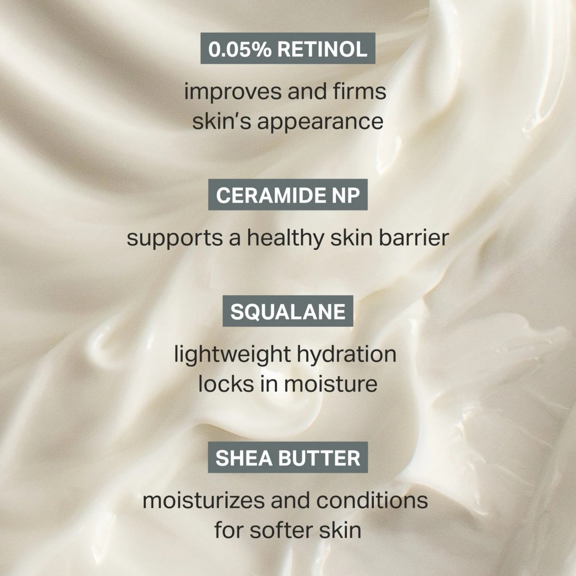 A lightweight, fragrance-free moisturiser that helps improve skin texture, tone, and firmness. Formulated with 0.05% retinol, barrier-strengthening ceramide NP, and moisture-boosting squalane, it supports smoother, softer skin without feeling heavy or greasy. Shea butter and lactic acid add gentle exfoliation and deep hydration, making it ideal for dry or uneven areas. Clinically tested on sensitive skin and suitable for nightly use, it absorbs quickly and leaves skin feeling nourished and renewed.