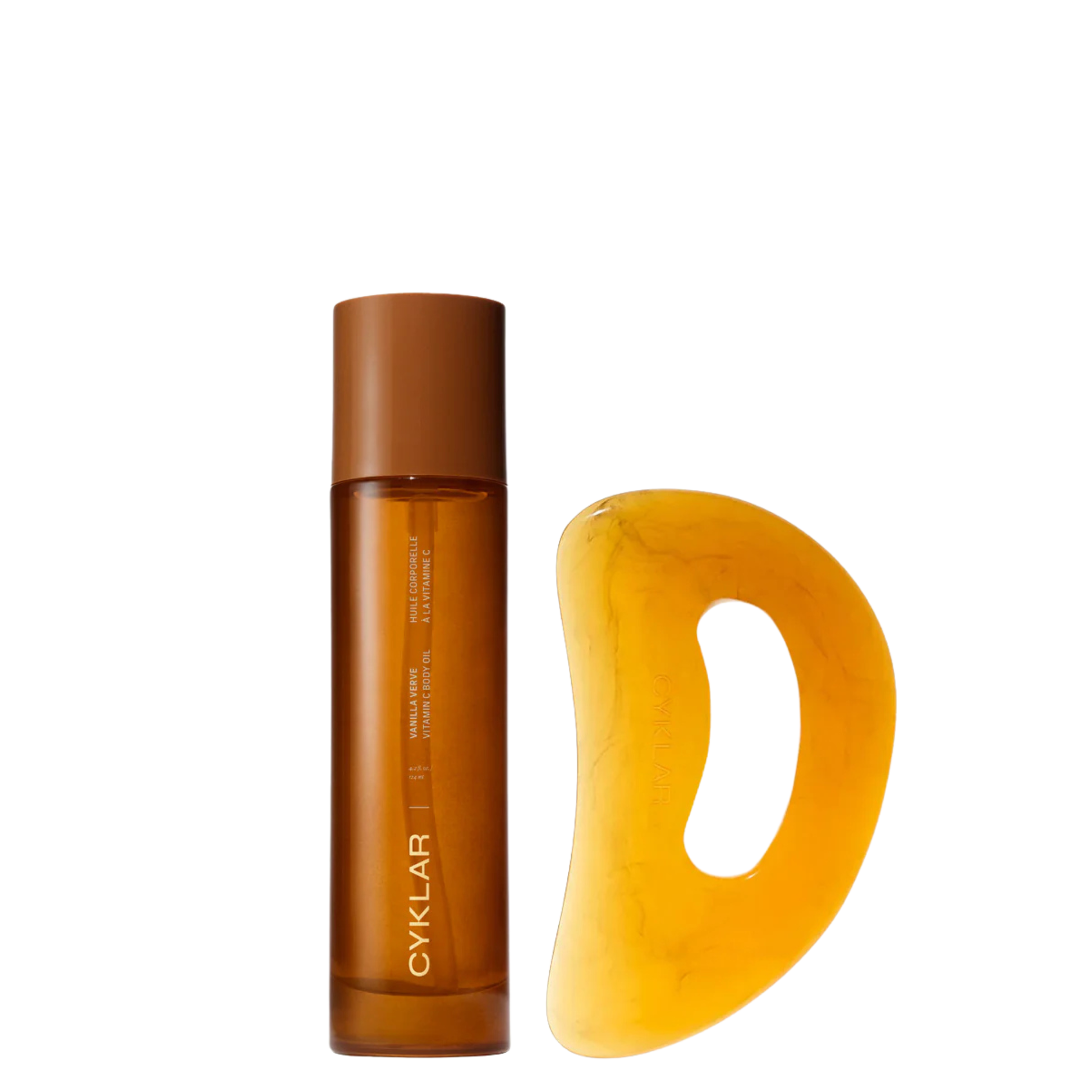 Vanilla Verve Glow Set by CYKLAR pairs a nutrient-rich body oil with a sleek body contour tool, beautifully presented in a gift box. Use the body oil to nourish and add glow. Glide the contour tool over skin to gently massage, support lymphatic drainage, and promote local circulation. The warm blend of vanilla, heliotrope and amber leaves skin soft, smooth and delicately scented.