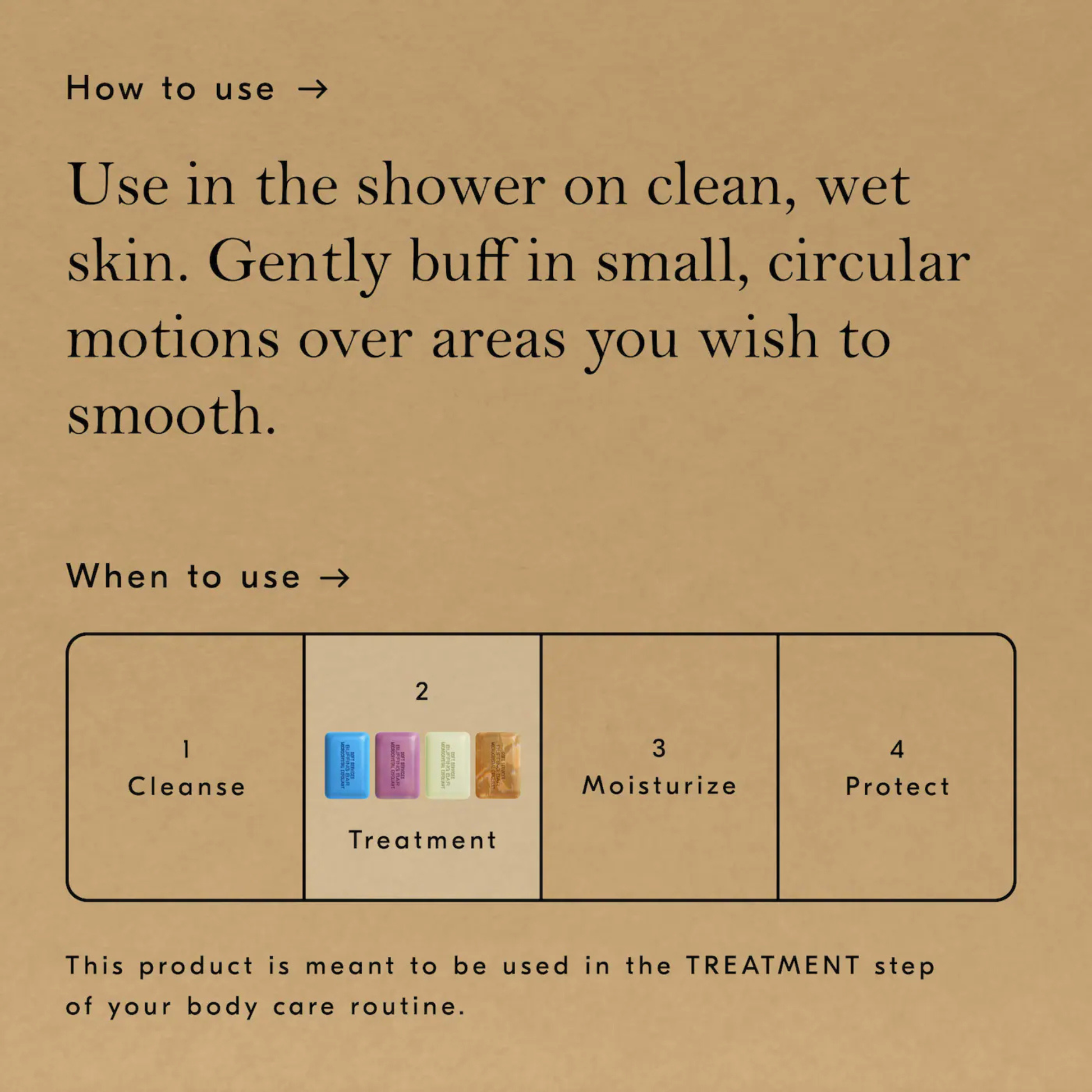 A library of mini Buffing Bars from Soft Services, featuring four versions of their bestselling physical exfoliant for the body. Designed for gifting, trialing, or travel, each bar helps maintain smooth, polished skin year-round. Formulated with fine magnesium oxide crystals in a creamy base of shea butter and aloe to gently buff away rough texture, bumps, and ingrown-prone areas. Size: 4 x 44.4 g