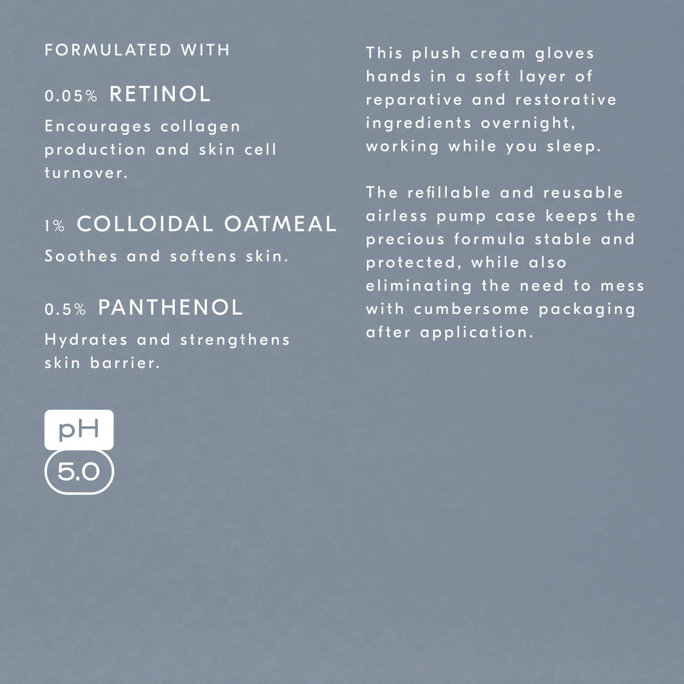 Formulated with retinol, colloidal oatmeal, and panthenol to repair and restore hardworking hands affected by manual work, harsh weather, or ageing. The medium-dense texture leaves hands soft, smooth, and hydrated by morning.