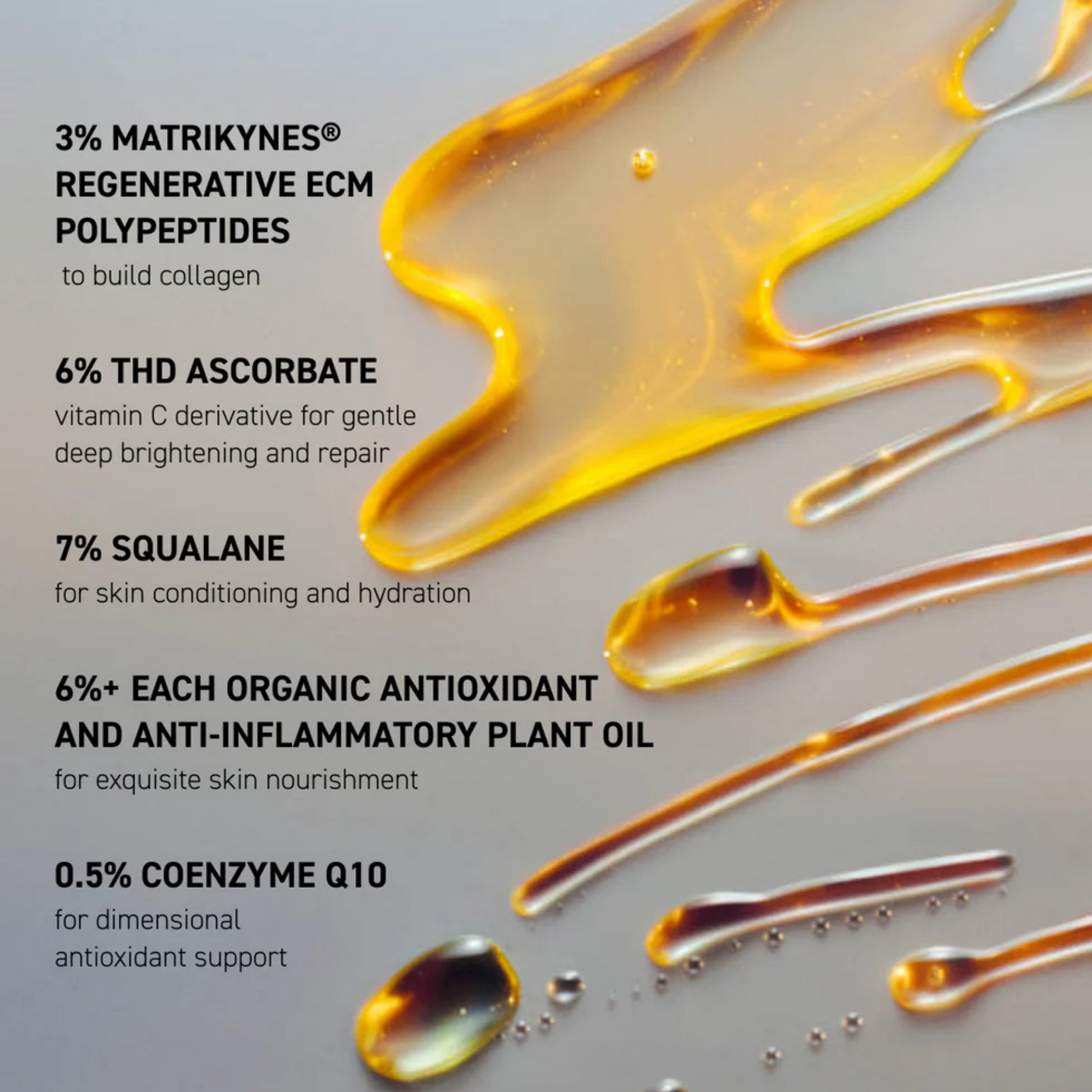 A concentrated, waterless oil serum designed to support skin repair, strengthen the barrier and deliver targeted antioxidant protection. Contains 3 percent Matrikynes regenerative peptides extracted from the extracellular matrix of upcycled bone. These naturally derived peptides demonstrate superior bioavailability compared to synthetic alternatives and are clinically proven to support tissue regeneration by reducing inflammation, oxidative stress and skin damage. The formula also includes 6 percent tetrahexyldecyl ascorbate, a stable vitamin C ester that promotes collagen production and brightens skin tone, 7 percent squalane to replenish the lipid barrier, and 0.5 percent Coenzyme Q10 to protect against free radical damage. Each botanical oil is included at or above 6 percent and is pesticide free. The fast absorbing texture nourishes deeply without leaving residue and can be used alone or alongside other treatments to improve skin structure, resilience and overall health.
